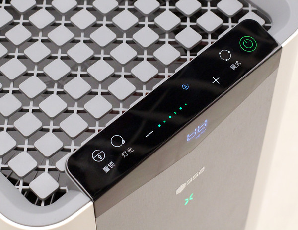 这款空气净化器正面设计有一块触控显示屏幕,采用了仰角设计,方便用户操作观看,十分人性化。启动后,机身正面中间位置的电源指示灯也会随之亮起,运行时显示为绿色,待机时则显示为橙色,还支持睡眠模式关闭背光灯。