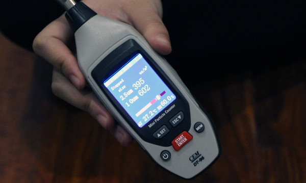 香烟燃烧尽后气味弥漫在房间里面,利用空气质量测试仪对室内空气污染指数进行测试,发现PM2.5颗粒物浓度值高达395μg/m³,属于极严重污染水平。开启空气净化器,将风速调至最大的强档模式,每10分钟左右会进入模拟家庭环境测试其中PM2.5的浓度值。