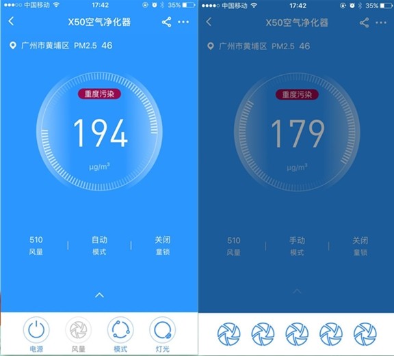 当链接成功后,可以进入主界面看到当前机器所在位置的PM2.5数值状况,这款空气净化器不仅拥有机身的实体按钮,还能通过手机APP端实现远程操控。