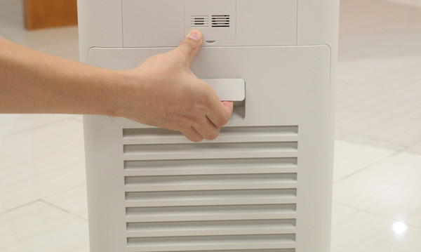 传感器下部是一面进风口,上面设有扳手,通过拉伸扳手就可以打开后盖板,一睹机身内部,也是更换滤网的地方。在使用中发现,当X50在运行或是待机状态时,如果打开其后盖板设备会自动切断电源,而当装回后盖板后,X50则会自动恢复电力进入待机状态.这样的设计提高了设备的安全性,避免了不必要的意外产生。