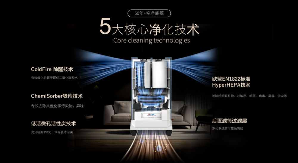 核心技术:与科德宝联合研发 360 多层复合滤网,含精细预过滤、HEPA、活性炭层,精准捕捉 0.1-0.3m 颗粒,催化分解甲醛,智能传感器精准监测浓度。